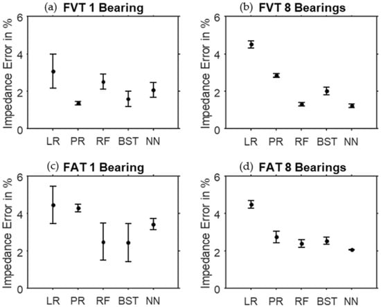 It turns out that algorithms based on a single bearing have about the same quality as for a stack of bearings, so that the training can be done individually for a bearing or a pre-trained algorithm can be considered over many bearings. In addition, bearing tolerances and the assembly process do not have a major influence on the measurement result. An overview of the expected error in all investigated models can be found in Figure 10. In addition to the mean error of the predicted impedance, its standard deviation is shown.