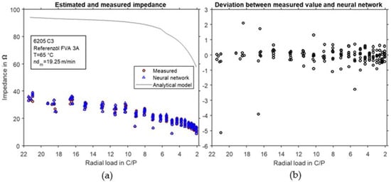 An example of predictions made by a neural network compared to actual measured impedances is shown in Figure 11. The accuracy is 98.97%. Furthermore, the well calculable correlation between the electrical impedance and the operating conditions shows that the impedance can also be an additional influencing variable for determining the remaining useful life of rolling bearings, as shown in []. The analytical model of Schirra et al. [] exhibits an almost constant offset to the measurement results, which is nearly independent of temperature and rotational speed. It is clearly shown in in Figure 11 that the description with a neural network does not have the observed offset between the measurement and the analytical calculation. In addition, the description with the neural network has the advantage that every single measuring point can be described with its exact temperature. In the experiment, the temperature is set to 65 °C, but the control is only accurate to 1 °C, so deviations by this difference are possible. The analytical model has the temperature of 65 °C as input parameter, while the neural network has the exact, measured temperature as input parameter for each individual point. Thus, the uncertainty that is introduced into the analytical calculation by the control is notably reduced here.