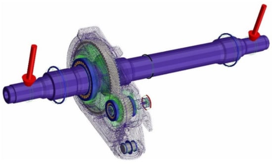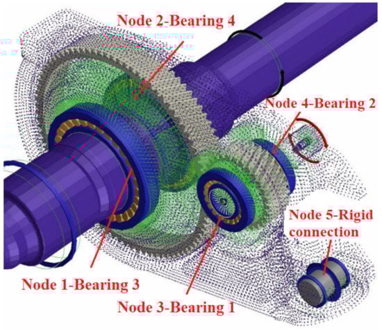 According to the parameters of the traction gear transmission system of the EMU (summarized in Table 1), Romax software is used to structure the simulation model. The three-dimensional model established is described in Figure 1.