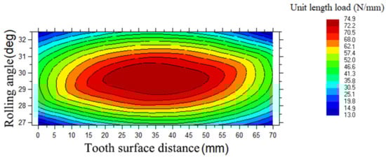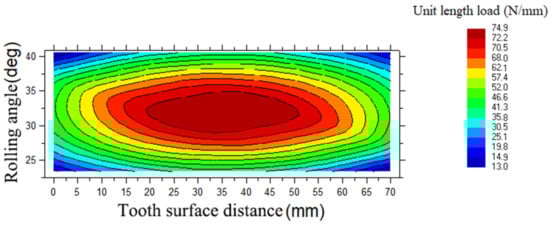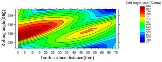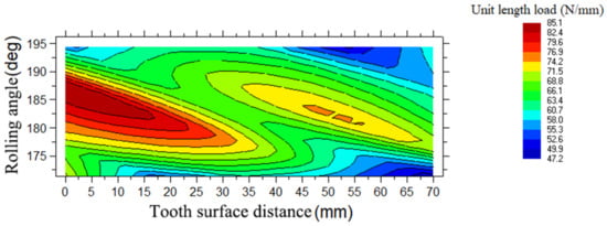 Analyzing the related theories and combining Formula (6), the unit load analysis of the traction gear transmission of EMU is carried out with the aid of Romax software, and obtain the load distribution per unit length of the pinion and the wheel as shown in Figure 2 and Figure 3.