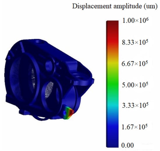 The modal analysis is actually to study the vibration of the gearbox of the EMU under a certain modal. Based on the existing theory and practical experience, when the load vibrates the box, the resonance of the low-order mode has a worse impact on the box. Through the analysis of the modal theory, combined with the calculation formula, the Romax software is used to extract the first 10 modes of the gearbox, and the results are shown in Table 6. Among them, the mode shape of the first mode is depicted in Figure 5.