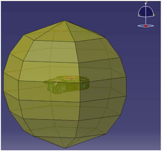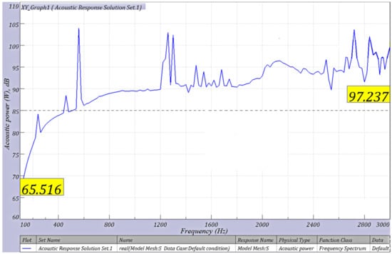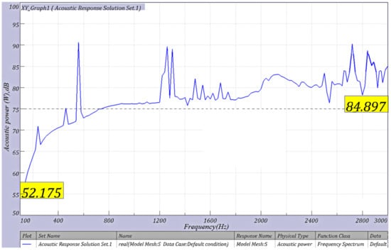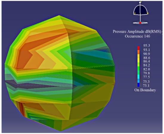 Virtual. Lab uses the acoustic boundary element method to generate the ISO standard spherical sound field diagram, exhibited in Figure 8. The point on the spherical sound field is 1 m away from the centre of the gear transmission system. The sound pressure level nephogram of the gear transmission radiated noise obtained is shown in Figure 9. The acoustic pressure level cloud diagram, combined with the Formulas (15)–(17), the radiated noise acoustic power level curve and RMS of acoustic power level can be obtained, as shown in Figure 10.