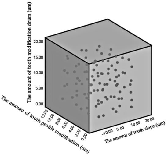 Latin Hypercube Design (LHD)’s working principle is as follows: uniformly divide each coordinate space of n-dimensional space into m parts to form an n-dimensional space with m samples expressed as m × n LHD. Latin Hypercube performs well in terms of pace-filling ability and has a solid ability to fit nonlinear responses. However, its disadvantage is the uneven distribution of test points. OptLHD principle of the method with LHD similar, but the space such as a probability distribution, thus improving the problem of uneven LHD test points, improved fitting precision experiment factors. The sample data extracted by the OptLHD method are uniformly distributed, as shown in Figure 11.