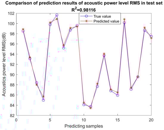 80% of the modification parameters-noise data were randomly selected as the training set of GRNN, and the remaining 20% were used to test the model. The number of neurons in the input layer was set to 3, the number of neurons in the mode layer was set to 100, and the transfer function was selected as Gaussian function to create the prediction model. The fitting effect of the test set of the GRNN on the data is illustrated in Figure 12.