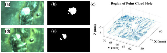 In order to identify the high reflective region in the image, the process is as follows: Firstly, the image is converted to a gray-scale image. Secondly, an appropriate threshold is selected for binarization operation. Then, the noise points in the image are filtered by the dilation and erosion operation, which can make the high reflective region completely closed inside and facilitate the extraction of the region. Finally, the identified high reflective region is expanded by 20 to 30 pixels to the surrounding region as the final high reflective region (shown in Figure 5b,e), of which the aim is to make the region contain enough effective data to facilitate the subsequent hole completion of the point cloud.