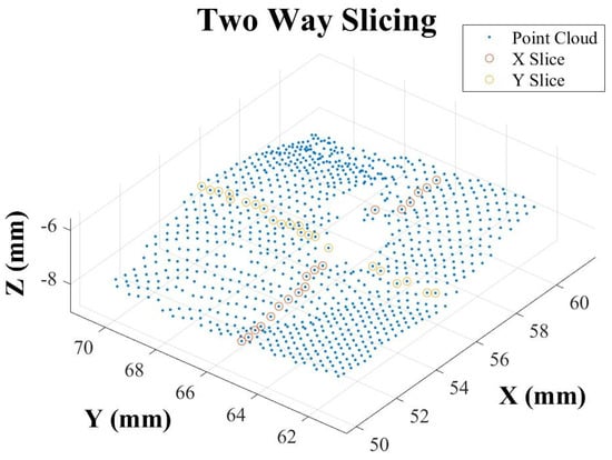 According to the coordinate value of the image of the high reflective region determined in Section 3.2.2, the point cloud data were cut and the point cloud information with holes generated due to high reflection was extracted. According to the corresponding 2D coordinate (X, Y) of this point cloud, slices were obtained along with the X and Y directions, respectively, with the width of 1 to 2-pixel values, as shown in Figure 6.