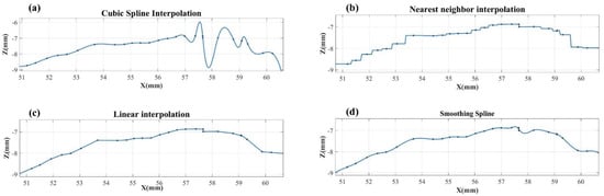 The curve fitted by the Cubic Spline Interpolation method has great fluctuation and cannot reflect the real surface topography of the measured object. The reason is that the data mutation of discrete points appears, which is because the distance of some points becomes very close after dimensionality reduction. The curves fitted by the Nearest Neighbor Interpolation and Linear Interpolation are not smooth, which does not correspond to the characteristics of continuous and smooth on highly reflective surfaces. The curve fitted by the Smoothing Spline method has no abnormal fluctuation and is very smooth, which can reflect the real surface topography of the measured object. Thus, the Smoothing Spline method Was adopted as our curve fitting method.