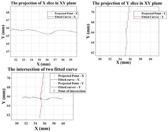 The two slices processed according to the two-way slicing method proposed in Section 3.3 were projected onto the XY plane, respectively, and then the Smoothing Spline method was used for curve fitting to obtain two intersecting curves. The intersection of the two curves was calculated, which can be used as the estimated X and Y of the coordinate of the missing data in the hole region of the point cloud. The results of the projection and the intersection were shown in Figure 8.