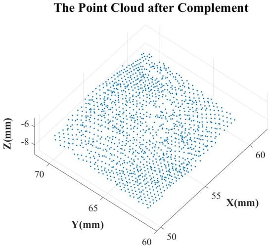 In order to make the result of point cloud hole completion closer to the real situation, an iterative algorithm for point cloud completion was designed. The point cloud data estimated by the above method were added to the extracted point cloud. In estimating the next point cloud data, the previous added point cloud estimation value was used as a true value for calculation. Although this increases the complexity of the algorithm, the effect of complement is better. The point cloud after complement is shown in Figure 9.