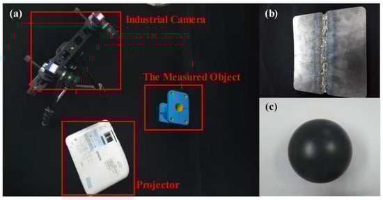 Experimental environment; (a) hardware composition of binocular stereo vision system; (b) weld for inspection; (c) standard ball with high reflective surface.