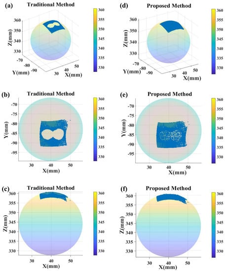 Measurement of a standard sphere. (a–c) The results measured by the traditional method; (d–f) the results measured by the proposed method.
