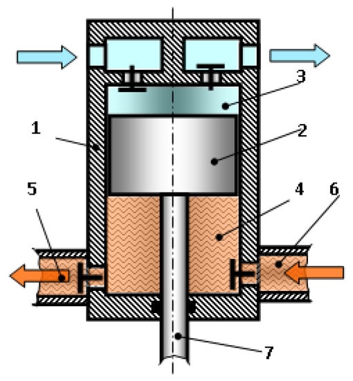Construction diagram of PHPM (1—cylinder; 2—piston; 3, 4—compressor and pump cavity; 5, 6—discharge and suction liquid nozzles; 7—plunger).