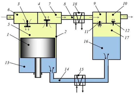 Thus, this gas compression scheme needs a compressor for preliminary gas compression and a pump for its final compression. This condition is satisfied by the two-stage PHPM shown in Figure 2. The PHPM stage 1 is a single-stage crosshead power machine with piston 1 located in cylinder 2. Piston 1 divides the working volume of cylinder 2 into compressor chamber 5 and pump chamber 13. The pumping chamber is connected by pipeline 14 with stage 2 of the machine, which has liquid volume 16 (liquid piston) and gas volume 17.