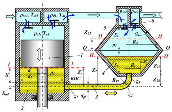 The two-stage piston hybrid power machine has stages 1 and 2 of compression and inter-stage connections for gas and liquid. Stage 1 of the investigated machine is a single-stage piston hybrid power machine. In [22], the mathematical model of working processes of a cross-head PHPM with a smooth seal is considered for the first time. The works [13,23] are devoted to the development of a mathematical model of the working processes of a cross-head PHPM with a gas chamber in the pump section. In these works, the simultaneous compression of liquid and gas in the working processes of a piston pump was considered for the first time.