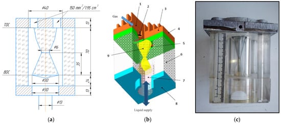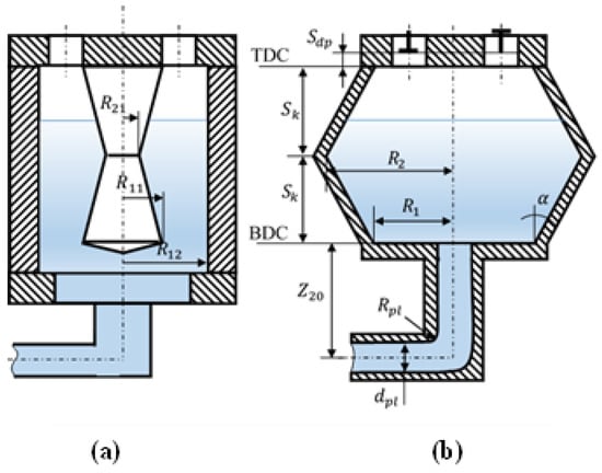 In [21], after analyzing the working processes and operating features of stage 2 of the high-pressure compressor, it was proposed to replace the cylindrical chamber (position “a” Figure 3) with a combined one (position “b” Figure 3) having two conical parts and one cylindrical. Conducted theoretical studies [21] established that the working chamber, consisting of two truncated cones, provides a high heat exchange surface, good stabilization of the liquid piston speed with high ergonomic parameters.
