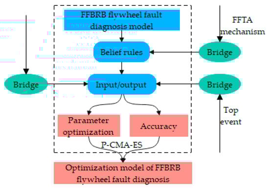 To solve the above problems, the FFBRB flywheel fault diagnosis model is proposed in this paper. In this model, the existing FFTA is used to construct the initial belief rules of BRB, and the transformation rules from FFTA to BRB are given. The model used the ER (evidential reasoning) algorithm to give the reasoning process of the model. In this model, the P-CMA-ES (projection covariance matrix adaptation evolutionary strategies) algorithm was used to optimize the parameters of the model, which improved the accuracy of the model. Figure 1 shows the overall transformation process of the model.