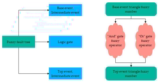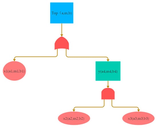 Step 2: Fuzzy fault tree analysis. Firstly, the logical relationship between events is sorted out and the fault tree graph of the fault diagnosis model is drawn. Then, this paper used a triangle fuzzy number to represent the failure probability of the FFTA basic event, introduce a fuzzy interval operator, calculate the triangle fuzzy number of occurrence probability of the middle event and top event and divide the data into three groups. For example, a triangle fuzzy number is used to represent the failure probability of a base event and base event , and interval fuzzy operator formula is used to obtain the occurrence probability of an intermediate event or top event . In order to facilitate subsequent data processing, this paper divided these data into three groups (a1, a2, a), (m1, m2, m), (b1, b2, b).