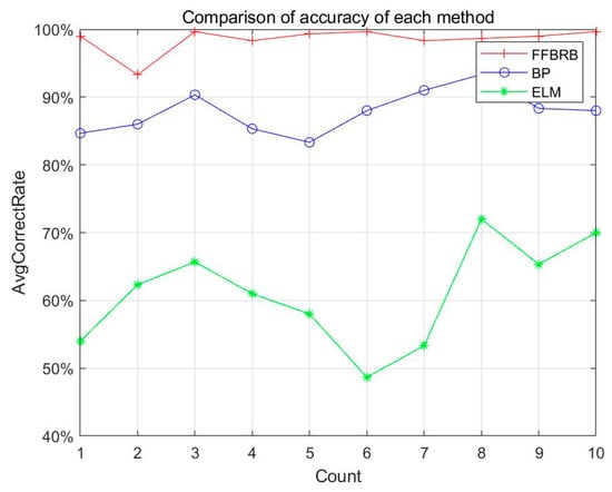 In the three groups of the FFBRB method, the average accuracy of the experimental fault diagnosis value obtained by us compared with the real value is 99.7%, 98.18% and 99.39%, respectively. This paper took the total average accuracy of the three groups of the three methods, and after calculation, the average accuracy of the BP method is 87.57%, the ELM method is 61.03%, the FFBRB method is 99.09%.