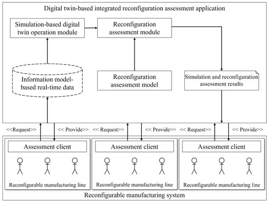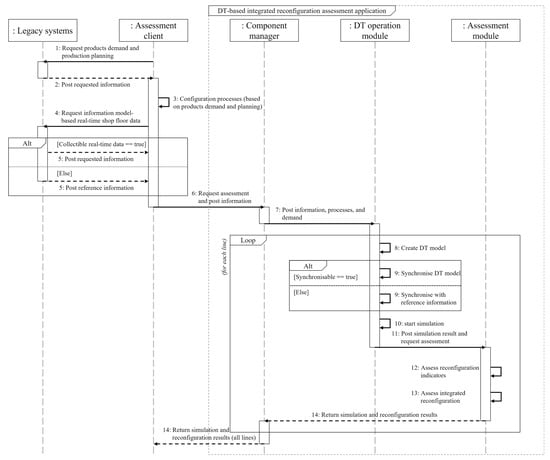 Figure 4 shows a sequence diagram for the operation procedure of the application. The assessment client checks the demand and production plan information prior to configuring the line and configures the processes required for production accordingly. Subsequently, when requesting an assessment, the information model-based real-time data collected from the production site to the legacy system, configured processes, and demand information are transmitted to the application. If real-time data cannot be collected at the production site, the DT model cannot be synchronised with the field, and only predefined reference data serving as reference information are transmitted. Thus, the configuration and function of the model are mapped using predefined reference data instead of real-time data in the DT model synchronisation step. This is the same as the existing simulation model; however, the user does not need to proceed with the simulation modelling work through an automated procedure. The received data are transferred to the operation module of the DT; the simulation results calculated by the DT module are transferred to the reconfiguration assessment module. These results are used for assessment based on the reconfiguration assessment model when calculating the reconfiguration indicators, and they are returned to the assessment client along with the simulation results. The assessment client can request an assessment of one or more lines, and the application runs until the assessments of all models are completed; the assessment results of all requested lines are returned to the assessment client to compare and analyse the results. Therefore, the assessment client can quickly and repeatedly draw and analyse the assessment results of repetitive line reconfiguration through the application, while confirming whether the demand and deadline are met, and the production plan is achievable. Line reconstruction can be performed by selecting the optimal one among several alternatives.