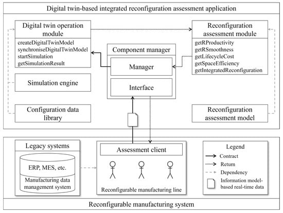 Figure 2 depicts the architectural framework of the proposed application. The framework is divided into an RMS comprising (1) an RML, (2) legacy systems that collect and process information collected from the line, (3) a component manager, (4) DT operation module, and (5) a reconfiguration assessment module that corresponds to the scope of application proposed in this study. The description of each component is provided below.
