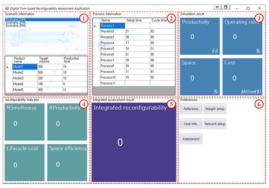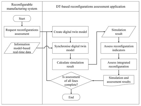 This study proposed an architectural framework of the application and a DT simulation method. Furthermore, an information model that can achieve interoperability by synchronising real-time data collected on site with the DT model and integrating distributed data was proposed. This model can describe resources and functions of the existing manufacturing system; however, it is suggested that it should be used to assess various reconfigurations while focusing on describing the RML. Finally, an assessment model that can comprehensively evaluate the reconfigurations of the RMS was defined. The application proposed in this study was applied to an automotive part production line in Iksan and Gimhae, South Korea, as a case study to verify its effectiveness. The proposed application enabled the comprehensive assessment of the feasibility of response to the production of various products by applying assessment scenarios to the DML, FML, and RML. Furthermore, it contributed to the selection of the optimal alternative for the production line.