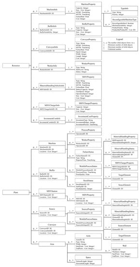 Figure 6 depicts classes representing the data and relationship between resource and plant. Data collected for the above-described information model are different for each class. An object-oriented concept information model to improve the performance for data storage and processing was proposed, because of the massive amount of manufacturing data are collected from IIoT, legacy systems, and business solutions that are being used. Further, this information model is used for building DT models of RMLs and evaluating reconfigurations. Moreover, it is possible to build DT models of manufacturing lines other than the RML. In this study, the proposed application is limited to utilising the real-time data collected in the field but not dealing with the method for the collection of the data, because there are many studies on the approaches for collecting the data from the field. Once the data are collected, the DT model can be constructed based on this information. If there is no real-time data exchange system in the field, it is impossible to reflect real-time data. Therefore, a simulation model was built to suit the information model format.