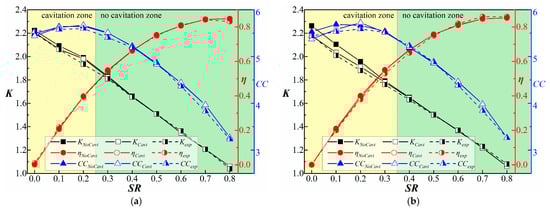 It can be concluded from Figure 6 that the occurrence and influence of cavitation are related to the rotating speeds, and cavitation has a significant effect on the performance of the torque converter. All performance indices decrease drastically with an increasing pump rotating speed and a decreasing speed ratio, indicating that high pump rotating speed and low turbine rotating speed will aggravate cavitation and cause serious performance deterioration. In our simulations, cavitation intensity/degree reaches its peak under stall condition when NP = 3000 rpm, and cavitation will reduce the torque of the turbine by 20.3%, the capacity constant by 18.1%, and the efficiency by 5.8%.