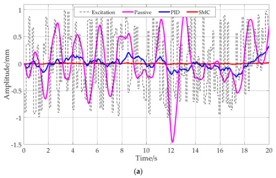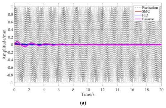 Figure 7 shows the results of a simulated comparison of the performance of the SMC, PID and the passive vibration control system under the excitation of a sinusoidal signal with an amplitude of 1 mm and a frequency of 5 rad/s. The passive system comes into play with inconspicuous effect. The response amplitude of the PID control is reduced by about 80%, while that of the SMC is reduced significantly.