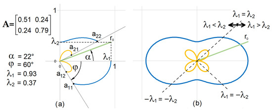 Each tensor can be expressed as a polynomial, which is called the quadratic form. For a planar tensor, it is enough to solve a polynomial of the second order, which corresponds to the quadratic equation. The equation roots can be real or complex. Complex roots emerge when the eigenvalues satisfy . This exchange is the result of the parameters swapping their positions in the main diagonal square matrix. In such a case, the discriminant is a negative number and the corresponding matrix is negative-definite, because the eigenvalues do not change. Each complex solution matches exactly one real solution, which is arrived at by swapping the order of eigenvalues to satisfy . The eigenvalues’ order does not result in a loss of information from the swap of their position. Thus, visualization can have the same form in both real and complex solutions. By reshuffling the order of eigenvalues, a solution in the range of real numbers is arrived at, because the tensor matrix is positive-definite. Such a result can be represented graphically.