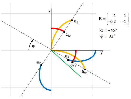 An interesting observation is that the symmetric tensor shape under zero angle of the initial state, as shown in Figure 15, has a proportional relation to the golden section ratio. This is significant because this commonly known principle, abundantly present in organic nature, was found at the heart of the tensor calculation. By means of the constant φ, the symmetric tensor is connected to the complex plane in the same way as the significant constants and . This is, therefore, likely to be a fundamental principle. The golden section ratio can also be encountered in relation to the strength of materials theory [19], as mentioned in the conclusion of an important paper by Michell [27]. These references to the golden section ratio are not limited to the plane only; they can also be found in attempts to describe higher dimensions. A paper dealing with transformations of a Pythagorean-like formula for surfaces immersed in three-dimensional space forming constant sectional curvature in a Riemann sphere examined the first, second, and third fundamental forms of the surface, proving that the immersed surfaces are totally round spheres with Gauss-like curvature φ + c, where φ is the golden ratio [28]. This, too, is a fundamental principle.