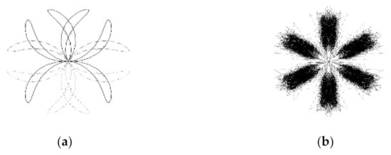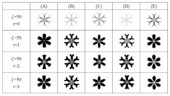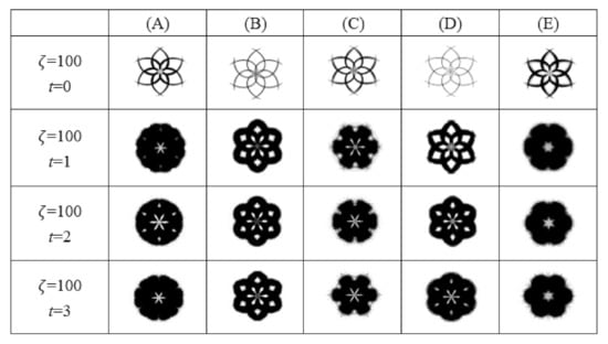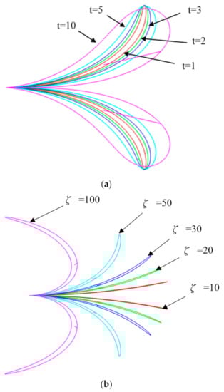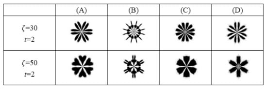 In addition, in the symmetrized dot pattern, both the weighting coefficient and weighting coefficient ζ have important impact on the symmetrized dot pattern. As shown in Figure 3, the weighting coefficient ζ is larger, the amount of deformation in the graph increases. At 10, 20, 30, 40, and 50, it can be seen that the graph becomes more curved. In addition, in the s symmetrized dot pattern, both of the weighting coefficient and weighting coefficient ζ are important impact on the symmetrized dot pattern. The weighting coefficient ζ is larger, the amount of deformation in the graph increases. At 10, 20, 30, 40, and 50, it can be seen that the graph becomes more curved.