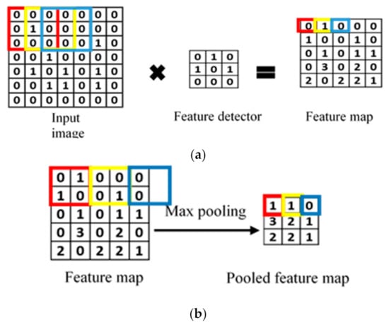 Through the convolution layer operation effect, just as using filters for pictures, we can extract the features of a picture. As shown in Figure 4, Figure 5 and Figure 6, the convolution kernel in the figure is a 3 × 3 matrix, which moves from left to right, from top to bottom, and sets the step when it is 1; the convolution kernel will be moved and multiplied by the feature matrix. The results will be added to the corresponding position, and the final output result will form a feature map. The pooling layer uses maximum pool sampling. It uses a non-linear sampling method to obtain image features through the convolution layer and uses these features to classify. When these features are obtained for analysis, they often generate a very large number of calculations. When acquiring features, a sampling method is performed to extract the maximum feature values to reduce the amount of data, taking the 2 × 2 pooling kernel and the moving step as 2 as an example, it can be seen that after the pooling layer operation, the maximum feature value will be left, and the parameters required for the next layer operation have been reduced. The fully connected layer is a flattened connection of the multi-layer convolutional layer and pooling layer results. The last feature map layer and the last feature map value is connected for image classification tasks.