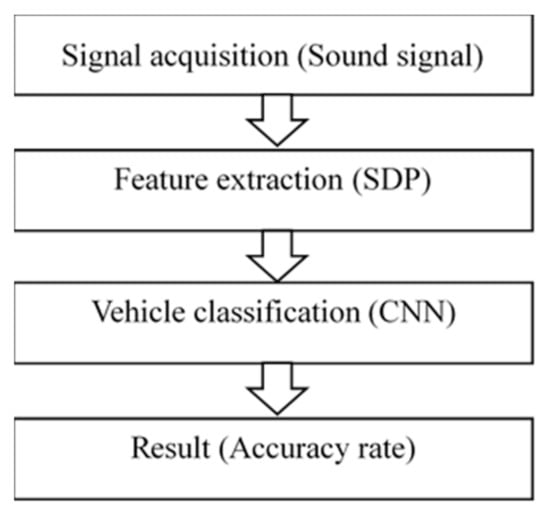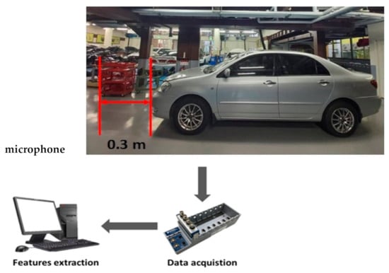 This study will identify vehicle types using different SDP noises. The vehicle identification process is shown in Figure 5. The data acquisition equipment includes microphone (PCB 426E01, PCB Piezotronics, New York, NY, USA), data acquisition system (NI-6024E, National Instruments, Austin, TX, USA), data acquisition card (NI-9233, National Instruments, Austin, TX, USA), notebook computer (ASUS, ASUS Technology, Taiwan) and five vehicles. The vehicle specifications are summarized in Table 1. A microphone was installed 0.3 m in front of the engine. The vehicle speed was maintained at 750 rpm. A data acquisition system and microphone were used to record the engine noise. Labview software (National Instruments, Austin, TX, USA) was used for engine acoustic signal processing. The sampling frequency is set at 2.5 kHz, sampling time is 10 s, has 25,000 points of amplitude data, 30 samples of each vehicle type, and a total of 150 data. This study will explore the vehicle acoustic SDP distribution. And the SDP coefficient ratio effect on picture recognition. Parameter research was conducted on the SDP of various vehicle types to explore the SDP parameter effect on the picture recognition rate. The experimental setup and process of test are shown in Figure 7.