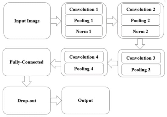 In the calculation process of CNN, add Local Response Normalization (LRN), because in the calculation of neural networks, in order to improve accuracy, with LRN will have a better suppression effect. Alex et al. proposed image classification with deep convolutional neural networks [10]. When using local response normalization, the results after the output of the pooling layer can be activated, and this method can make the response larger. In addition, on the contrary, suppressing the small value of the response, to achieve the effect of suppression, can make the model have better adaptability. The calculation formula of LRN is introduced below. a represents the result after the output of the pooling layer, which will be the result of including batches, image length, image width, and the number of neurons passing through. Equation (10) represents the principle calculation of LRN. Containing four kinds of data, is expressed in the positions of these four data output structure, h is at the h kernel at position (x, y), the parameter k is the addition in the denominator, α is the scaling parameter, the size selected by n/2, and β is the exponential term, K, α, n/2, β are self-defined parameters.