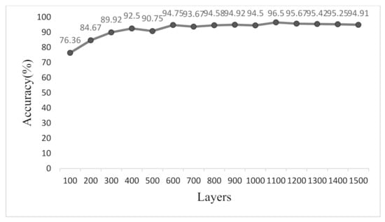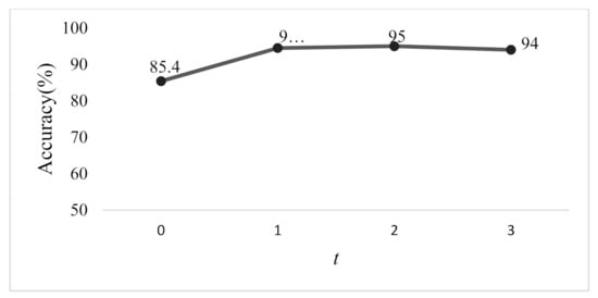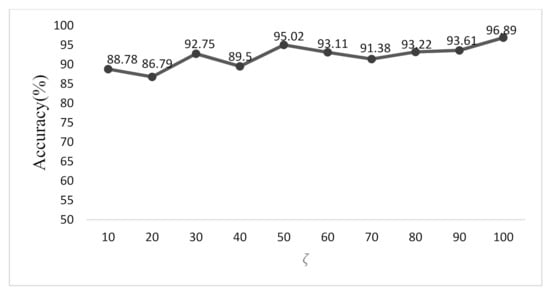 Figure 13. Recognition rates of different time delay coefficients. - In addition, we also tried to understand the weighting coefficient ζ influence on the recognition rate. When drawing a point-symmetrical diagram, the weighting coefficient was changed from 10 to 100, and the effect on the average recognition rate was discussed. The results are shown in Figure 14. It shows that when the weighting coefficients ζ are 10, 20, and 40, the average recognition effect is below 90%, and the remaining weighting coefficients can reach more than 90%. Among them, the recognition is the best when the weighting coefficient is 100, and the weighting coefficient ζ is 50. It can reach an average recognition result of more than 95%. This study highlights the possibility of engine signal classification and fault diagnosis when the vehicle is stationary. Although its sound characteristics are somewhat different from the actual driving conditions, the related technology should be applicable to the actual driving conditions. The condition will be applied in other application of electrical vehicle classification.