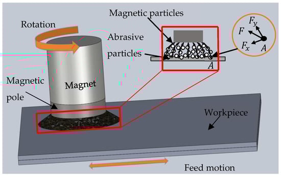 With the rapid development of electronic technology, optical technology and aerospace technology, the requirements for workpiece surface accuracy in many fields are higher and higher. For these components, their surfaces are required to be smooth, have low roughness, and have high geometric accuracy. The magnetic abrasive finishing (MAF) process is an important non-traditional finishing process [1,2]. The MAF process uses magnetic particles to form a flexible brush structure under the action of a magnetic field, mixing abrasive particles with magnetic particles, and using the motor to drive the magnetic brush to rotate so as to drive the abrasive particles to move relative to the workpiece and to realize the finishing of the workpiece [3].