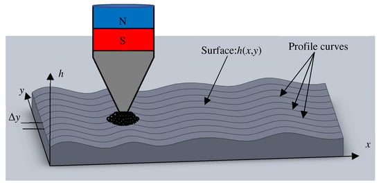 Previous studies have proven that the planar quality of the processed area can be improved by controlling the feed speed of the workpiece, but only a single track was finished [25]. Now the finishing area needs to be extended to a larger planar area. Assuming that the initial profile of the workpiece is shown in Figure 2, and its profile curves are shown as in the figure in the direction , due to the flexibility of the magnetic brush, the workpiece can be finished and its roughness can be reduced while maintaining the original profile of the workpiece. However, from another point of view, can magnetic abrasive finishing technology be used to reduce the height difference of the surface and improve its flatness? A simple method that is easy to think of is to change the processing time or feed speed at different positions. For example, where the surface is high, the feed speed is slower and the processing time is longer. On the contrary, where the surface is low, the feed speed is faster and the processing time is shorter. In other words, the purpose of correcting the plane can be realized by controlling the motion conditions during finishing.