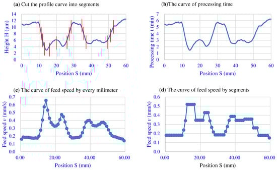 Figure 3a shows a profile curve after filtering. If the finishing efficiency η is known, the relationship between the processing time curve and the position can be calculated according to Equation (8), as shown in Figure 3b. Then, according to Equations (9) and (12), the speed sequence can be calculated, as shown in Figure 3c.