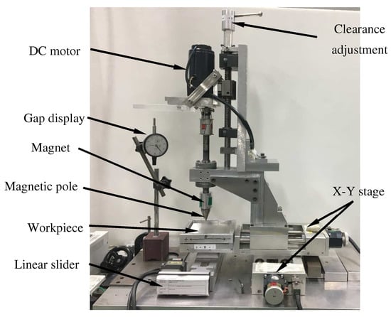 A photo of the experimental setup used in this research is shown in Figure 5. The X-Y stage is used to control the processing position of the workpiece. The DC motor drives the magnetic poles and the magnetic brush rotation to process the workpiece. The linear feed motor realizes the control of the feed speed by changing its speed to realize variable speed processing. The height adjustment device is used to adjust the processing gap, which can be accurate to 0.1 mm.