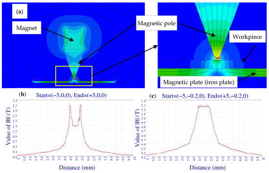The simulations with magnetic particles and with the magnetic plate under the workpiece. (a) The magnetic field distribution near the magnetic pole; (b) The magnetic field intensity |B| at a distance of 0 mm from the magnetic pole; (c) The magnetic field intensity |B| at a distance of 0.2 mm from the magnetic pole.
