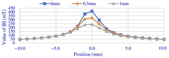Figure 7 shows the results of measuring the magnetic field near the magnetic pole using the Tesla meter. Within 10 mm on both sides of the magnetic pole, the distances between the sensor and the surface of the magnetic pole are set to 0 mm, 0.5 mm and 1.0 mm. It can be seen from the measurement results that as the distance increases, the magnetic field strength becomes weaker and weaker. However, due to the small magnetic pole diameter, the edge effect of magnetic field strength is weakened.
