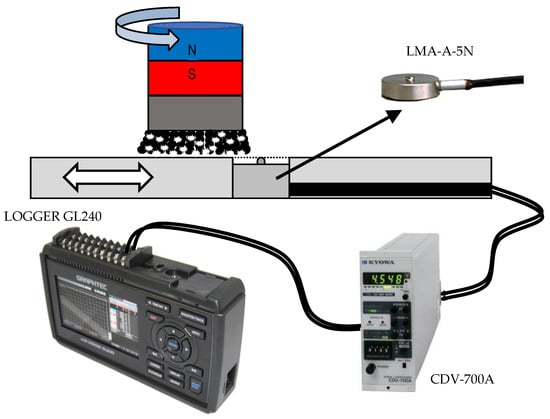 In order to better analyze the characteristics of the magnetic pole, a device is designed to measure the pressure distribution of the magnetic brush during processing. The measurement method is shown in Figure 8. The pressure sensor used here is the LMA-A-5N small pressure sensor from KYOWA. The pressure can be converted into an electrical signal by the sensor, which is amplified by an amplifier and sends the data to a recording instrument. In this research, the amplifier used is the CDV-700A (KYOWA, Chofugaoka 3-5-1, Chofu, Tokyo, 182-8520), and the data logging instrument is the LOGGER GL240 (Graphtec Corporation, 58/3-5 4th Floor, Sukhumvit 63 (Ekkamai) Rd., Phra Khanong-Nuea, Wattana, Bangkok 10110, Thailand).