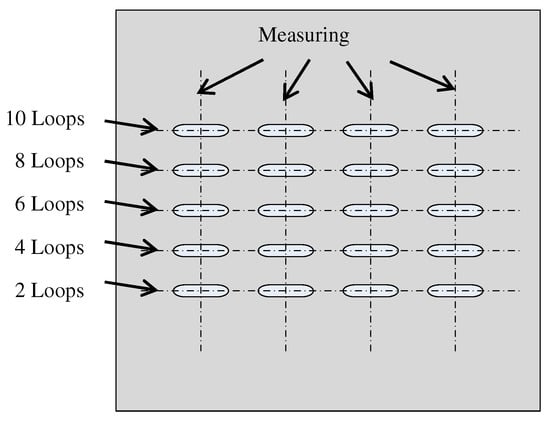 To reasonably control the feed speed during finishing, it is necessary to measure the finishing efficiency of the magnetic pole. The finishing object selected is a 100 mm × 100 mm × 2 mm A5052 plate in this research. The calculation method of the finishing efficiency is the processing of five tracks with a length of 6 mm on the same workpiece, and each track is processed with 2-4-6-8-10 loops, respectively, as shown in Figure 11. Then the cross-section curve is measured to calculate the finishing depth, and the average of four times is used as the average finishing efficiency. The experiment conditions are shown in Table 1. The feed speed of the workpiece is 0.2 mms−1, and the rotation speed of the magnetic pole is 400 rmin−1. The abrasive liquid is composed of 0.5 mL of oil (Honilo 988) and 1 g of #4000 WA particles, and the magnetic brush was soaked in the abrasive liquid for processing each time.