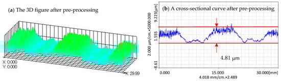 Figure 14a shows the 3D figure and Figure 14b shows a cross-sectional curve of the surface profile of the workpiece after pre-processing. Since the pre-processing is processed by using a uniform feed speed, the cross-sectional curves at different positions are almost the same.