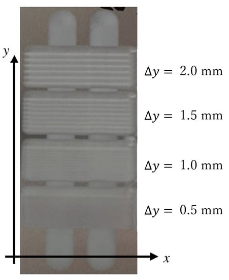 A photo of the processed workpiece is shown in Figure 15. It can be seen from the picture that as the step size of ∆y decreases, the surface becomes more uniform. The traces of the transition between the two processing tracks are also reduced. When Δy is 0.5 mm or 1.0 mm, the traces of this transition are not obvious. When Δy is 0.5 mm, the traces of this transition are almost indistinguishable with the naked eye. However, in terms of processing time, a long processing time is required at 0.5 mm spacing, so the efficiency is slightly lower. The measurement results will be compared below.