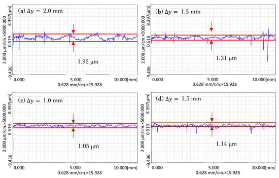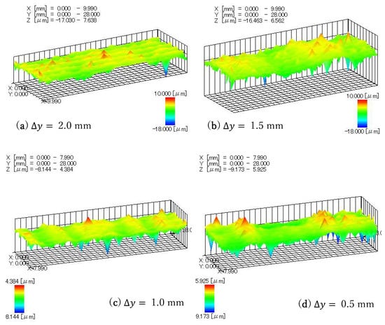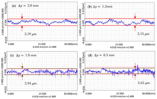 As shown in Figure 17, the x-direction is the direction measured along the processing feed direction. It can be seen that the surface was significantly improved compared with before processing, and the surface of Δy = 1.0 mm and 0.5 mm is relatively flat. This is because when ∆y is equal to 1.0 mm and 0.5 mm, the processing time is relatively long, and when ∆y is equal to 1.5 mm and 2.0 mm, the processing time is relatively short.