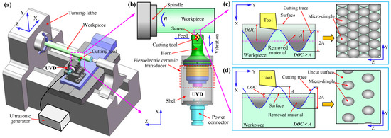 Illustration of surface texturing of 1D UVAT: (a) the overall assembly drawing of equipment for 1D UVAT; (b) principle of the texturing process; (c) continuous cutting condition (DOC > A); (d) intermittent cutting condition (DOC < A).