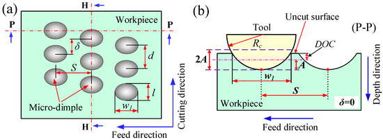 Figure 2 depicts the illustration of micro-textured surfaces, generated under intermittent cutting conditions, including the arrangement and geometry of micro-dimples and cross-sectional dimple profiles along feed direction. According to Figure 2a, the arranged discrete micro-dimples can be formed on the workpiece surface. The important factors influencing the shape, size, and distribution of micro-dimples include w1 (dimple width along feed direction), l (dimple length along cutting direction), S (distance between adjacent dimples along feed direction), d (distance between adjacent dimples along cutting direction), and δ (phase-shift distance of adjacent dimples).