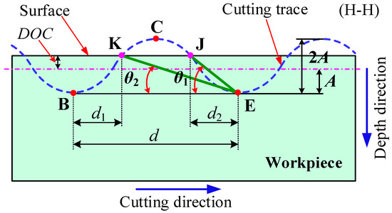 Under the intermittent cutting condition, the cutting trace on XY plane, as indicated by the cross-section hh in cutting direction, is detailedly described in Figure 3. In a vibration period, the cutting tool moves along cutting trace from bottom point B, through the point K and then away from the workpiece surface to reach the vertex C. After point C, the cutting tool then moves through point J to reach the bottom point (E). Thus, it can be seen that the BK and JE segments belong to the cutting stage of workpiece material, and the KJ segment belongs to the non-cutting stage of workpiece material. The distance in cutting direction of BK segment is defined to be d1, and the distance in cutting direction of JE segment is defined to be d2, as shown in Figure 3. It can be found that the BK and JE segments of the cutting trace are symmetrically distributed around vertex C. Therefore, the d1 is equal to the d2. The angle between JE and BE is θ1, and the angle between KE and BE is θ2. The tangent values of θ1 and θ2 are defined to be the intersecting rates η1 and η2, respectively, which can be expressed by the following: