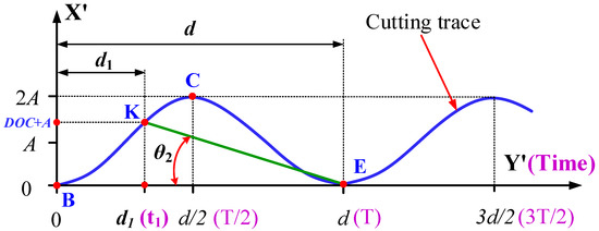 As shown in Figure 4, the time point corresponding to the d1 is t1, which is the time taken for the cutting tool moving from point B, along the cutting trace, to point K. The value of X′ axis corresponds to t1 is DOC + A. By introducing the t1 and DOC + A into the Equation (7), it can get the following equation:
